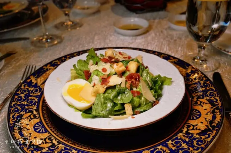 套餐中提供的沙拉是凱薩沙拉,但因為卡琳我不愛凱薩沙拉醬,向服務人員詢問後,廚房特地客製了清爽的檸檬醬,搭配新鮮生菜、乳酪、培根真的很開胃。