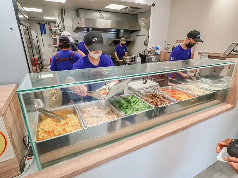 他們家主要是做外帶跟外送的,所以店裡面沒有提供內用的座位喔。整個店的設計很簡單明瞭,直接在櫃檯點餐,然後就可以順著旁邊的小菜櫃挑選自己喜歡的小菜。在店的左邊有一個自助區,那邊有提供例湯,還有耐熱袋跟紙碗,大家想用哪種就自己拿喔。