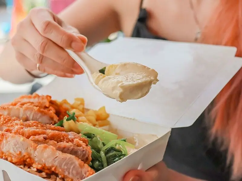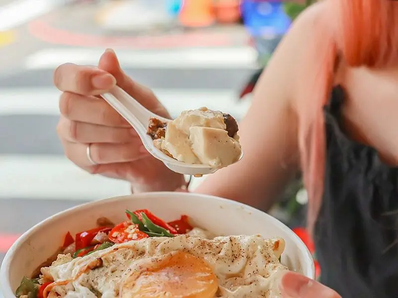 這個真的是他們家的王牌!聽說很多老顧客都是為了這一碗來的,就像小編一樣,只要$90就能吃到這麼夠味又讓人滿足的雜碎飯,CP值真的很高。白飯上面淋了超香濃的醬汁,還有滷得入味的三層肉,搭配一點點辣椒跟糯米椒,那個味道真的是絕配!再加上一顆半熟的荷包蛋,整個口感變得更滑順豐富,難怪大家都說這是他們心中的經典款。小菜的部分可以自己選,小編這次選了米糕跟蒸蛋。
