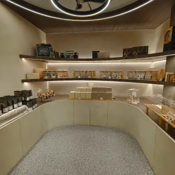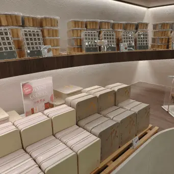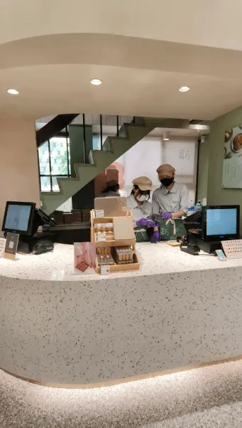 進到店裡,右手邊是放滿精美可頌的玻璃展示櫃,光看就流口水,左手邊是他們的結帳櫃檯,那個設計是彎彎曲曲的流線造型,搭配老宅本身的磨石子地板,整個復古文青感爆棚,超有味道的。店的最裡面展示著各種伴手禮禮盒,除了主打的圓可頌,他們家還有超厲害的手工蛋捲、千層捲酥等等好多種禮盒可以選,像是我們家阿白,就超級愛他們家的千層捲酥,一個人可以半天就把一整盒秒殺,是有沒有這麼誇張啦。