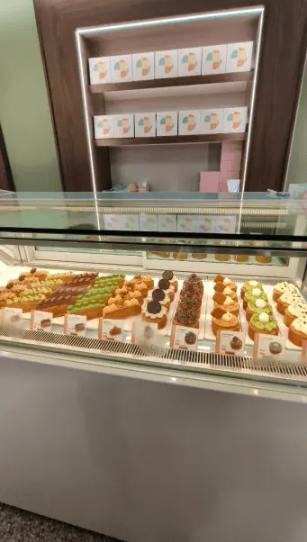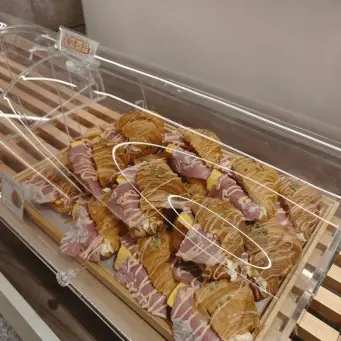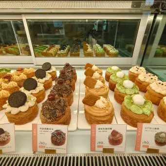 冷藏櫃裡面的日菓頌擺得好整齊好漂亮,還有各種可頌禮盒跟牛角可頌,你在台中獻烘焙很難一次看到這麼多種類的可頌排排站,畢竟台中店到現在都還是夯到爆的排隊名店。獻烘焙總共有三種可頌,有層次感的日菓頌、外層酥脆的圓可頌、還有餡料飽滿的牛角可頌。他們的店名「獻」就是取「餡」的諧音啦,所以他們家專門賣各種有包餡的可頌。日菓頌的特色就是層次最多、造型最美,圓可頌則是外面吃起來最酥脆,裡面的餡料會順著圓圓的紋路散開,牛角可頌的口感最接近傳統可頌,但內餡是給得最大方的,總之這三款可頌各有各的迷人之處,真的會讓人選擇障礙大爆發。