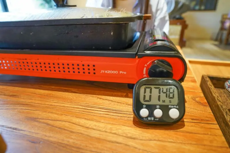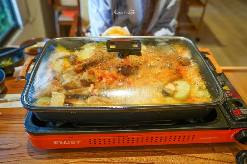 他們家的烤魚上桌後,要先用大火悶煮,等到裡面煮滾了之後再轉成小火。接著就要用旁邊的計時器倒數8分鐘,時間到了服務人員就會來幫你開蓋,香噴噴的烤魚就完成啦。