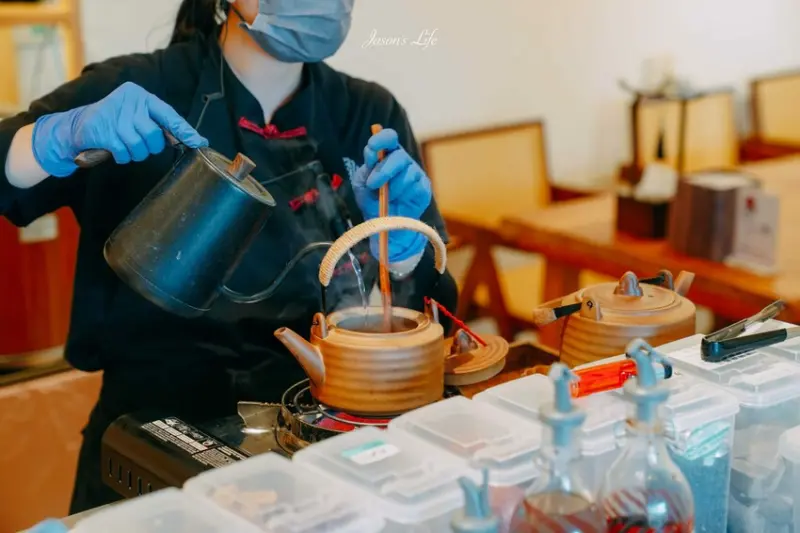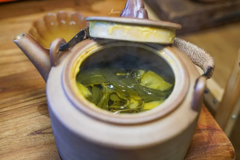 飲料的部分,我看到櫃檯有人一壺一壺地在煮茶水,打開蓋子是真的有泡開的茶葉,裡面還加入了柳橙、百香果、紅冰糖調製而成,喝起來有著天然的水果酸甜香氣,我點的是橙香青茶290元,而且啊,點一壺茶還會附上茶點可以搭配享用喔。
