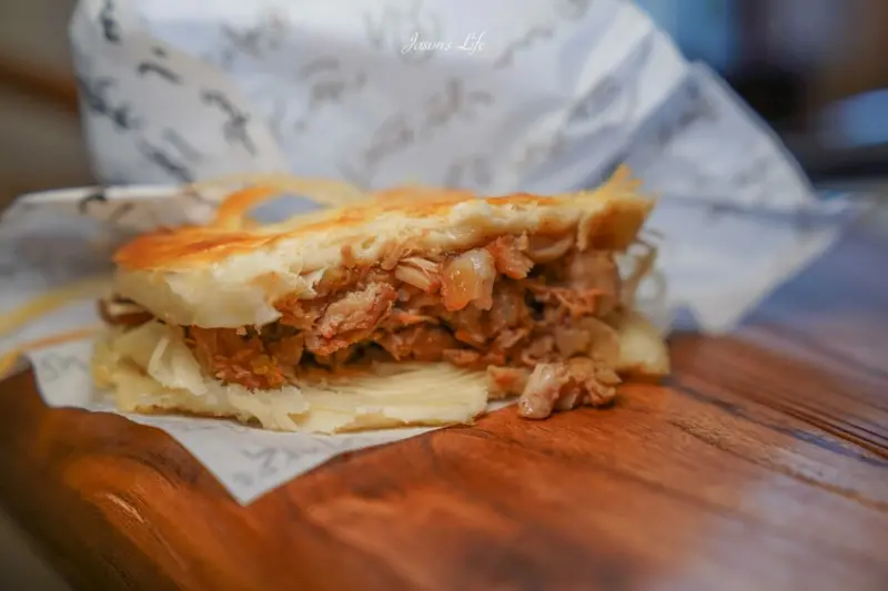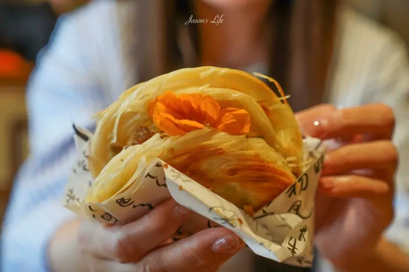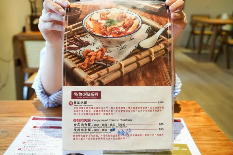 他們家還有一個很特別的小點,叫做台式肉夾饃85元,這是陝西的特色麵食,酥脆的餅皮夾著紅燒豬肉、酸菜、香菜、花生粉。你可以把它想像成是陝西的刈包,但吃起來很不一樣,滿好吃的。