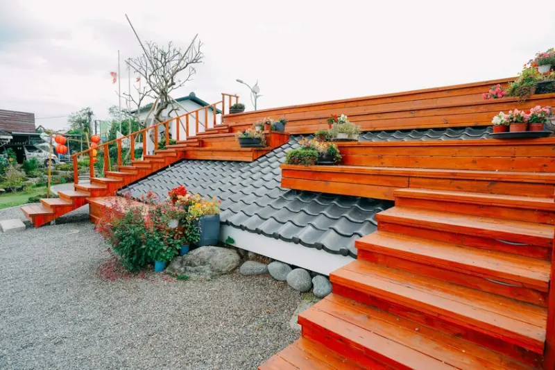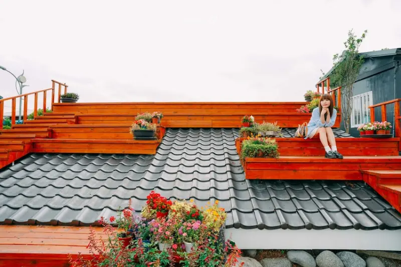「屋頂上的花園」是用回收的屋瓦打造的,如果你剛好在等位置,園區裡面真的有很多地方可以讓你拍拍照。像這個屋瓦屋頂上就種滿了花花草草,還設計了階梯式的座位,不只能拍照,等候的客人也可以坐在那邊休息。