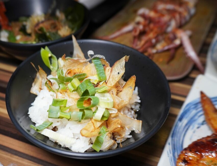 也可以來燒鳥串道吉林店吃晚餐,店內用餐,招待茶泡飯跟柴魚醬拌飯免費吃到飽。