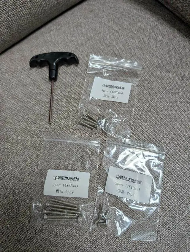 配件有上架支架、燈源、底座和鎖螺絲的工具
