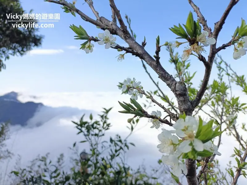 一看到這個指示牌,跟著指示牌走就對了,走不到五分鐘的時間就可以看見雲海,天氣好的話能見度是非常遠的。我們造訪的時候是二月份,恰巧是梅花綻放的時候,美景加上凜冽寒風中綻放的梅花真是美不勝收,這也正是為什麼二延平步道不論什麼季節都這麼夯的原因。