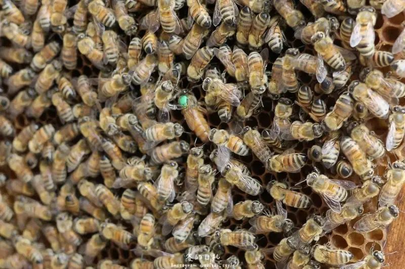 圖三則是蜂后本尊現身啦!店家貼心地在牠背上做了小小的綠色記號,方便辨認。