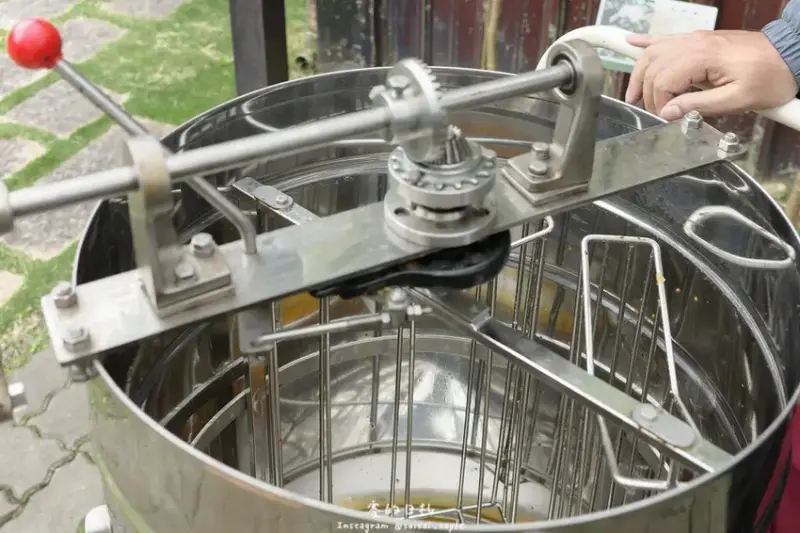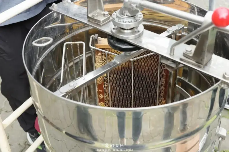 現場由老闆親自示範,從蜜蜂辛苦儲存好的蜂巢中取出一框滿滿的蜂蜜,接著放進特製的蜂巢離心機裡,用手動旋轉的方式,將蜜從蜂巢中一點一滴地「甩」出來。