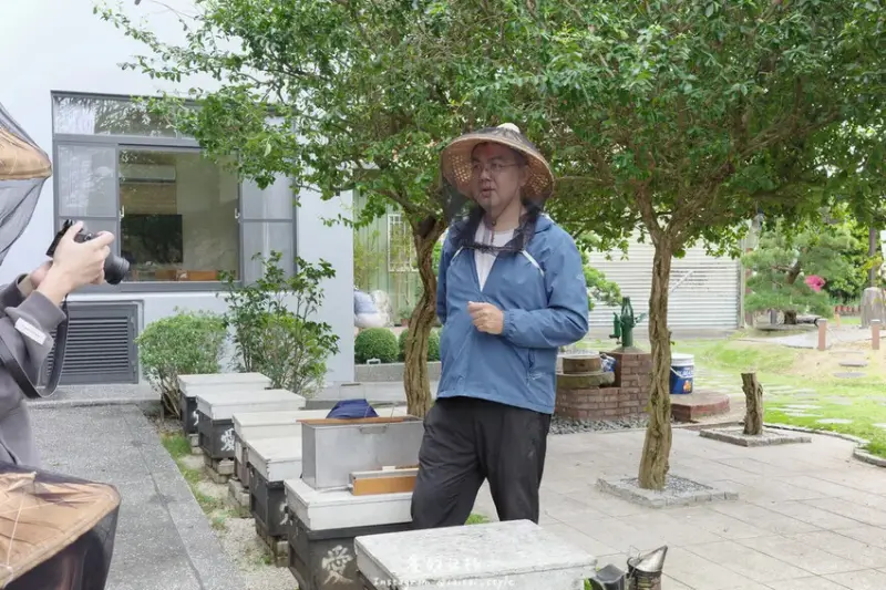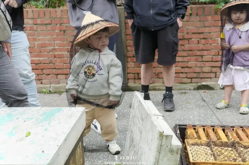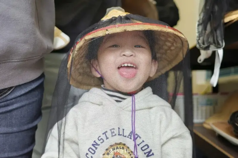 因為是戶外的空間,並且會真的遇到蜜蜂,所以基本的保護還是需要做到,店家會提供簡單的防蜂帽,可以安全的保護著我們的臉跟頭部,兒子戴上後開心到不行呢。