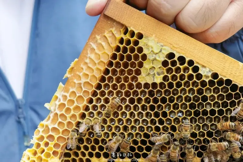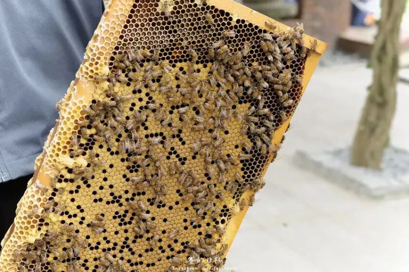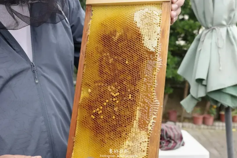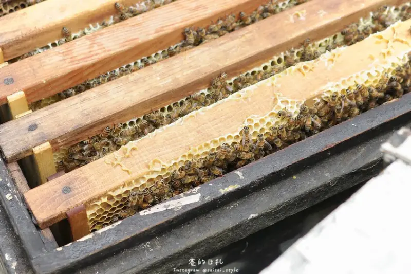 從換上防蜂帽開始,兒子就興奮到不行,不只能近距離觀察蜂巢、了解蜜蜂分工,還能看到老闆現場採蜜,甚至將蜂蜜裝進瓶裡,整個過程新鮮又有趣,店家也會一邊介紹蜜蜂的習性,像是怎麼分辨女王蜂、工蜂和雄蜂,連大人都聽得津津有味。