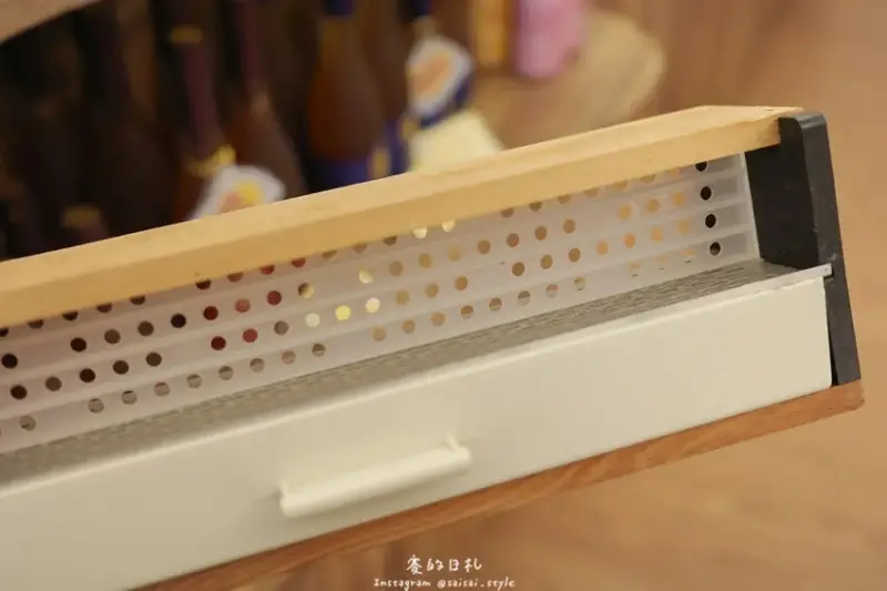 我們還嘗試了一點點現採的櫸木花粉。圖中這個像抽屜的裝置,其實是專門收集花粉用的:當蜜蜂通過細小孔洞時,腿上的花粉會自然掉落到下方的小槽中,因此保留了最原始的天然樣貌。
