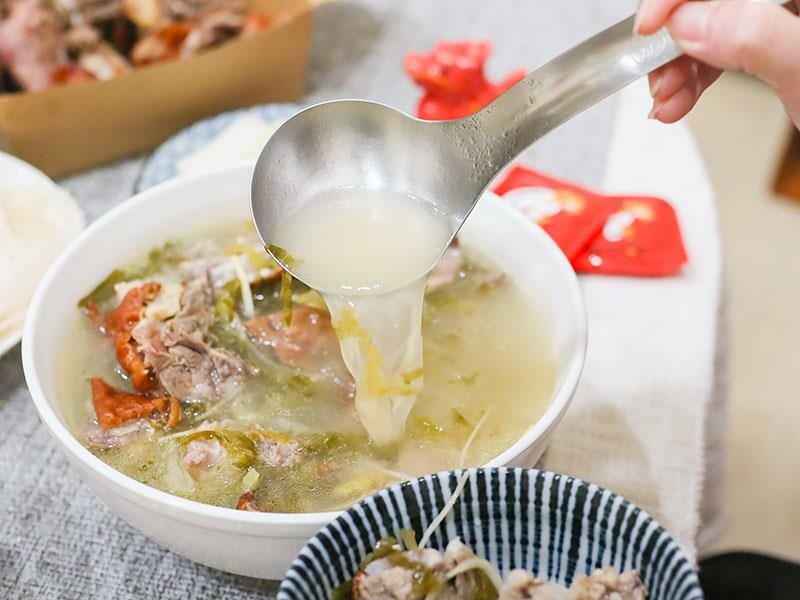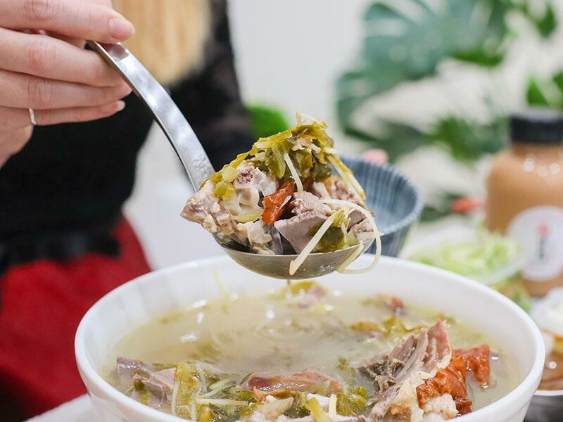 酸酸菜鴨骨湯。 這鍋酸菜鴨骨湯讓整套烤鴨吃起來有個完美的結尾。鴨架跟酸菜一起熬煮,湯的顏色乳白乳白的,帶著一點微酸的香氣。他們的酸菜給得很大方,不手軟。裡面還加了薑絲,讓湯頭喝起來更清爽。這個口味連我這個很挑酸菜的客家人都可以接受,大家可以放心喝啦。
