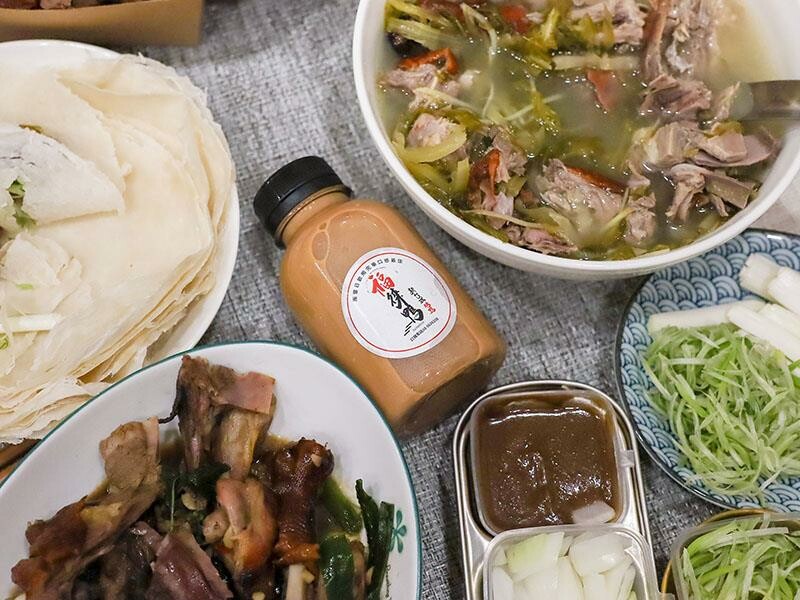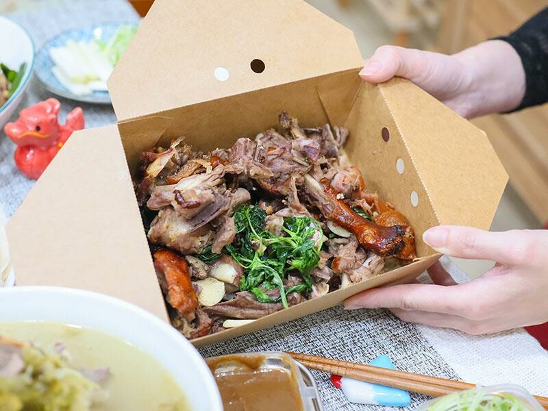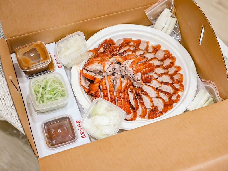 歡樂全家餐是母親節他們主打的套餐,一份是1250元。裡面有經典片鴨、醬爆鴨骨、酸菜鴨湯和鹽酥鴨骨,總共用了1.5隻鴨,份量超霸氣。這次他們的外帶盒有改版,設計得比較穩,用機車載回家也不怕會倒。蔥段、洋蔥片和各種醬料都放得乾乾淨淨的,外帶或送禮都很有面子。新款的外帶盒把寬度縮小了一點,對我們機車族來說,放在腳踏墊上更穩更安全。