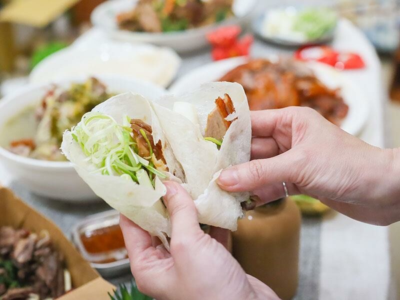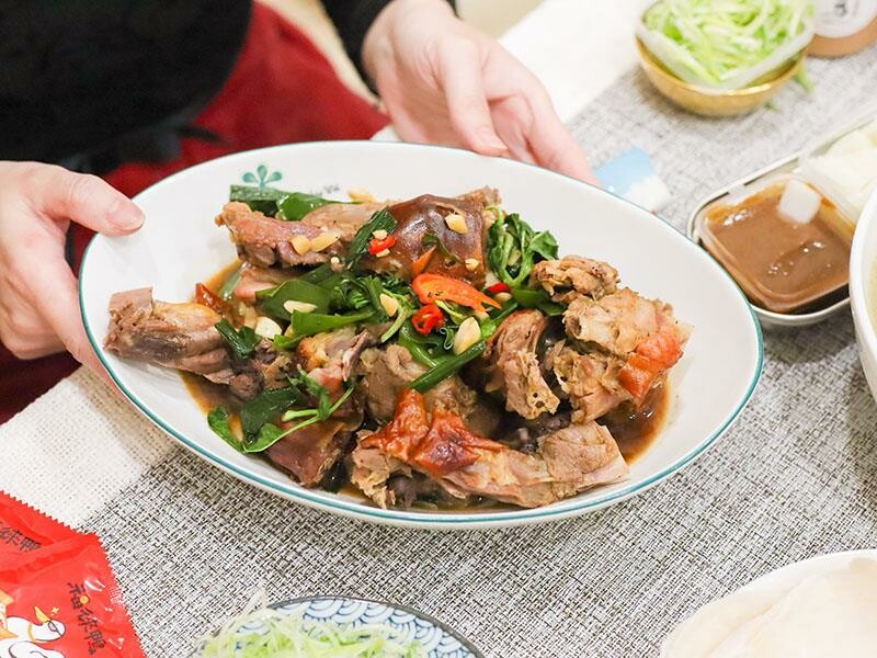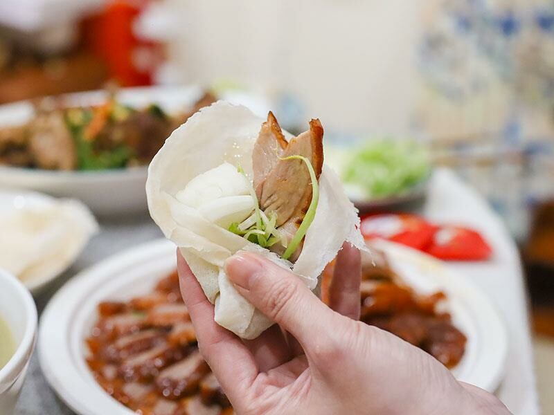 他們本身用的鴨子就是3.5斤,已經比較大隻了。歡樂全家餐用1.5隻鴨來做片鴨,份量真的不是蓋的。秘製沾醬配上蔥段、蔥花,再用荷葉餅包起來,就是片鴨的經典吃法。