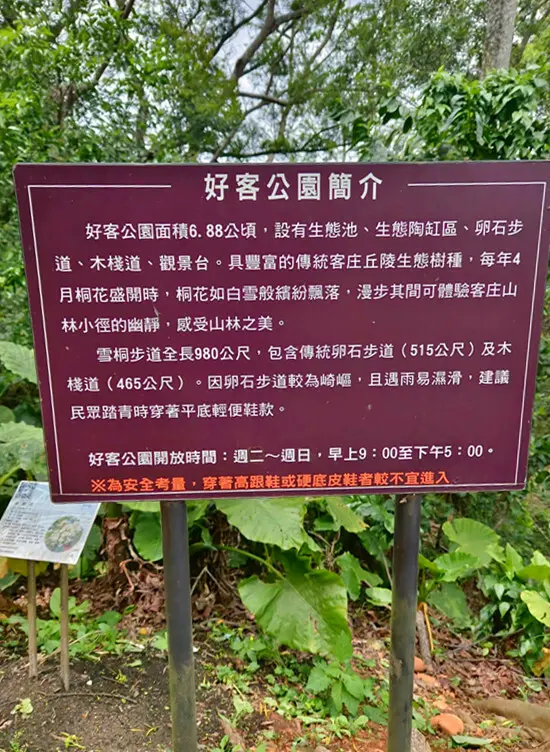 這裡還有關於好客公園的簡介,告訴大家公園面積有6.88公頃,設有生態池、生態陶缸區、卵石步道、木棧道和觀景台等,二旁都有豐富的傳統客庄丘陵生態樹種,每年月來可欣賞桐花季美景,但因卵石步道崎嶇,遇雨容易濕滑,建議大家不宜穿高跟鞋或硬底皮鞋,最好選擇輕便好走的鞋子,才能悠哉欣賞沿途風光景緻