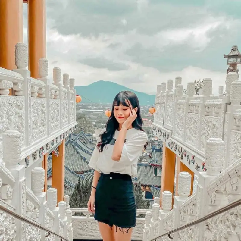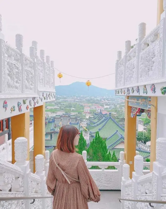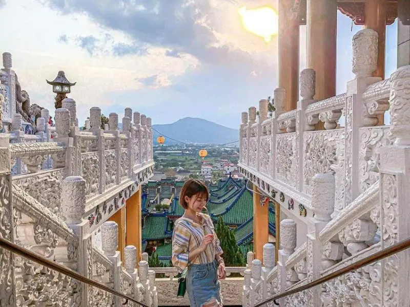 來地母廟除了能拜拜祈求保佑之外,位處金鷹山山麓上絕佳的地理位置,能從高處一眼眺望埔里美景,慢慢的爬上最高的樓層,背景映著青綠色屋瓦襯著藍色屋脊的建築,樓梯精美的雕刻,自然灑下的陽光,如詩如畫的風景讓許多人佇足在這裡。
