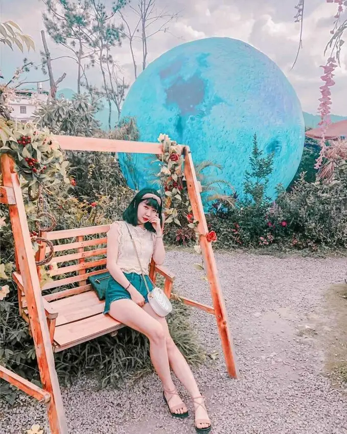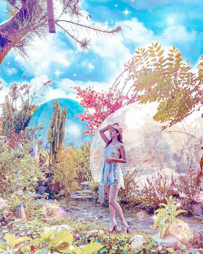 多肉秘境園區內種滿了各式各樣的植物,圍繞在月球和透明泡泡屋周邊,泡泡屋的後面還有一顆藍色的大星球,淡藍色的球體配上一旁茂密的綠色植物,就好像有一顆小行星掉到這裡一樣。