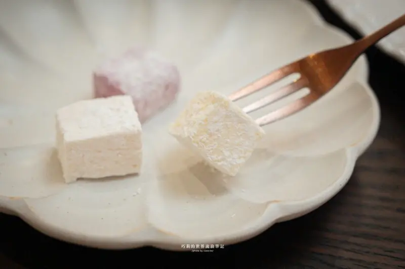 棉花糖有三種口味,玫瑰、百香果、藍莓,酸甜清爽不膩口,少見的喜餅選擇,很特別也很好吃~