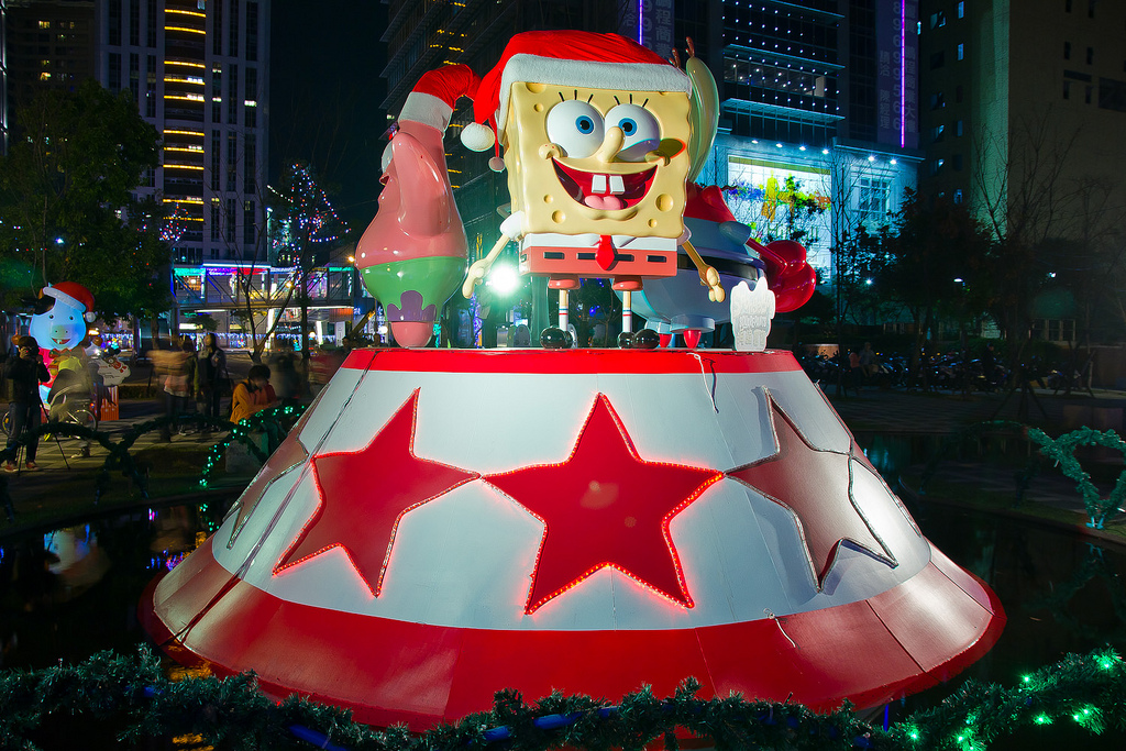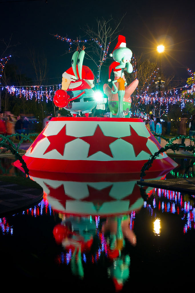海綿寶寶的城堡加上週邊的燈飾顯得更亮眼