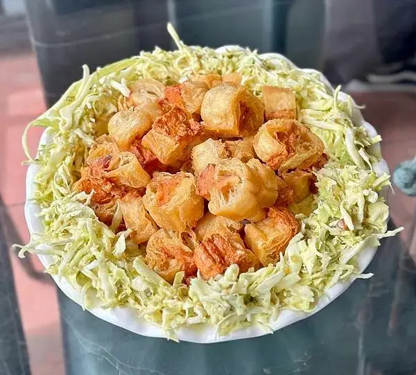 【古味油枝捲】是把油條裡面包新鮮的花枝漿再去炸,吃起來外面酥酥脆脆,裡面卻是鮮甜Q彈,下面還有生菜沙拉,一起吃口感更有層次也不會膩。