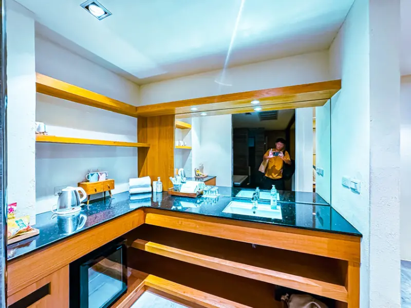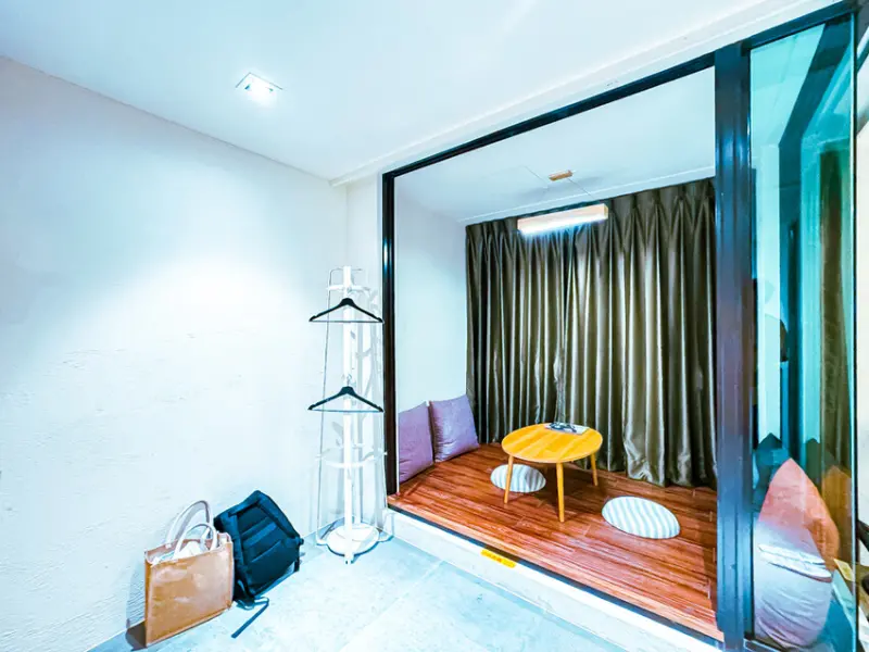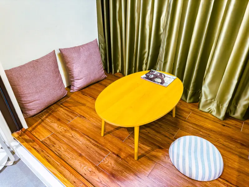 這次住的豪華雙人房一定要特別講一下,房間設計得很精美。入口處有個日式禪風的小空間,這裡完全是個可以放空發呆、看書休息的好地方,也可以邊喝茶邊欣賞外面的景色,享受片刻的寧靜。
