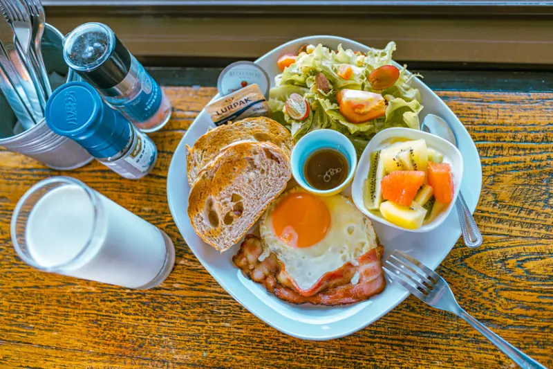 貝拉司漫民宿的早餐也很棒喔,他們提供了歐陸式和素食等不同的選擇,飲品部分有牛奶、咖啡、柳丁汁可以選,聽起來就很豐富。早餐做得很精緻,味道也很美味。想像一下,早上沐浴在清晨的陽光下用餐,一邊看著窗外的泳池、綠植還有藍藍的天空,是不是光想就覺得很愉快又舒心呀!