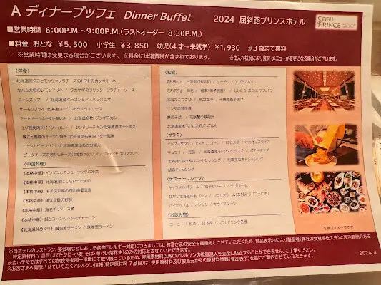 房間內還有提供飯店buffet早餐與晚餐提供的餐點內容與價目供旅客參考。