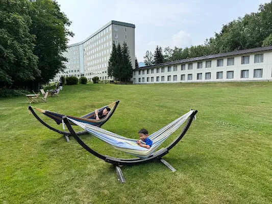 飯店後方有廣闊的草地可以讓小孩盡情的奔跑,還有躺椅可以躺呢~