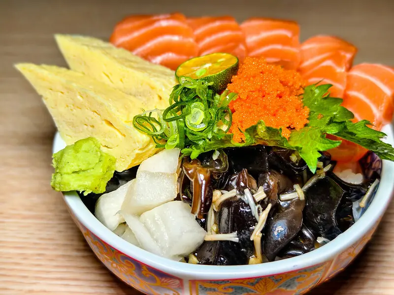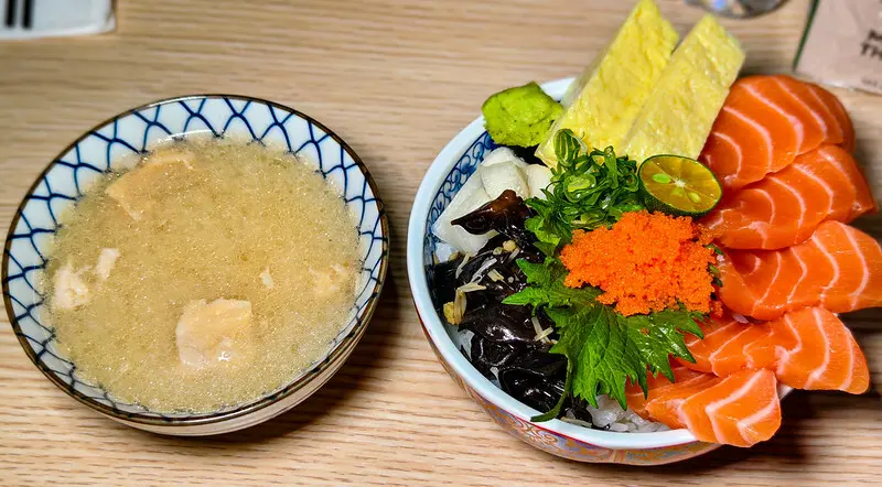 我點了鮭魚背丼,碗是小小一個啦,裡面有五片鮭魚。擺盤看起來還不錯,旁邊有醃蘿蔔、木耳跟黑豆,還有玉子燒。芥末就是一般的那種。鮭魚本身的水準就是一般般啦,它是用背肉,如果你想要油花比較多的腹肉啊,就要另外加錢囉。這個就看你個人的喜好啦。鮭魚的厚度跟大小我覺得還可以。