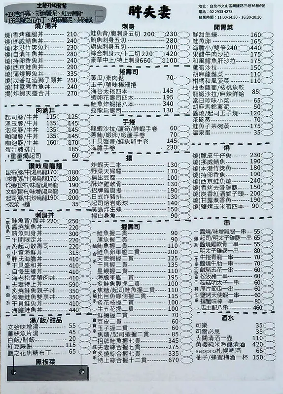 總體來說,胖夫妻日式料理真的是台北市文山區一間CP值很高的日式小餐館。它最大的特色就是走平價路線,但是料理卻很用心。餐點種類爆炸多,從丼飯、炸物、定食到串燒都有,而且還有每天限量的小菜可以搭,讓你吃到很有日式風味的感覺。雖然店裡座位不多,但是環境是舒服的,很多學生和住戶都愛來這內用或外帶。免費的味噌湯和麥茶可以自己裝,這點真的讓用餐滿足度up up。有些料像鮭魚背肉或起司牛丼就比較普通一點,如果你想吃好一點的就要加價。但炸牡蠣跟自漬午魚定食表現就很讚,尤其是午魚烤得很棒,超對台灣人的胃。串燒呢,雖然不是專業串燒店的水準,但也保有基本的美味。如果你在文山區想找實惠又吃得到用心的日式料理,胖夫妻日式料理真的很值得你來試試看啦。