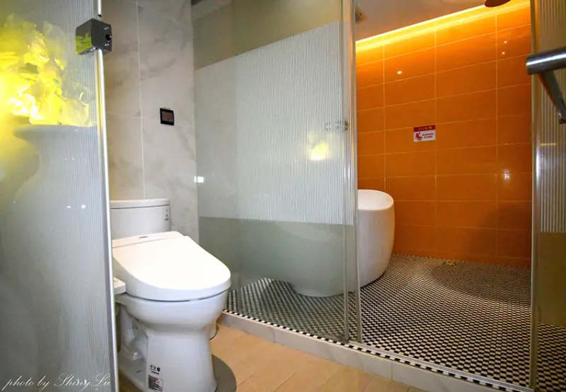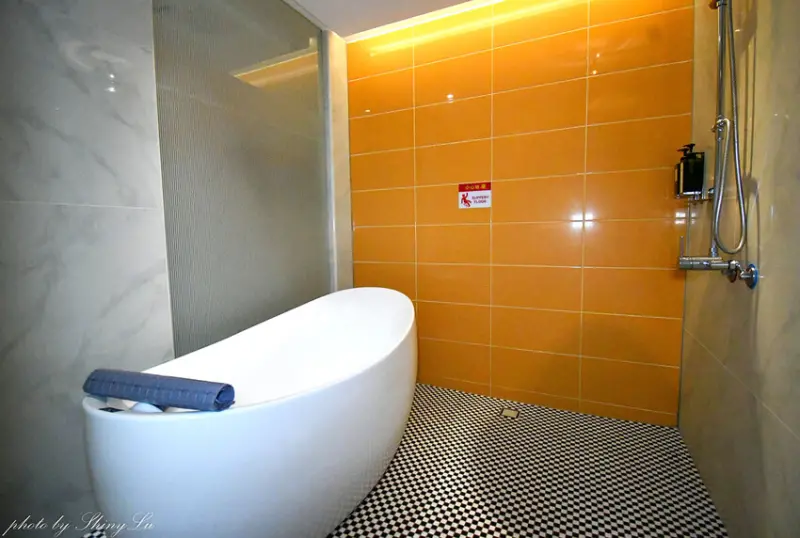 淋浴區是獨立空間,裡面有一個蛋型的單人浴缸,還有洗髮精、沐浴乳