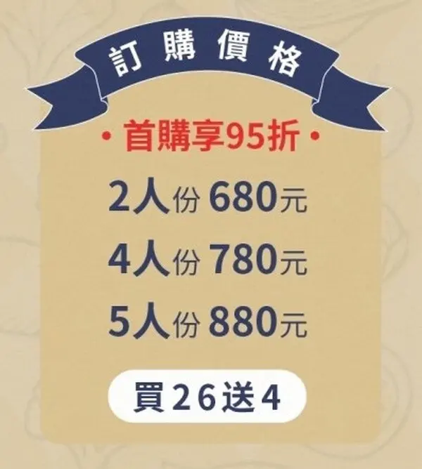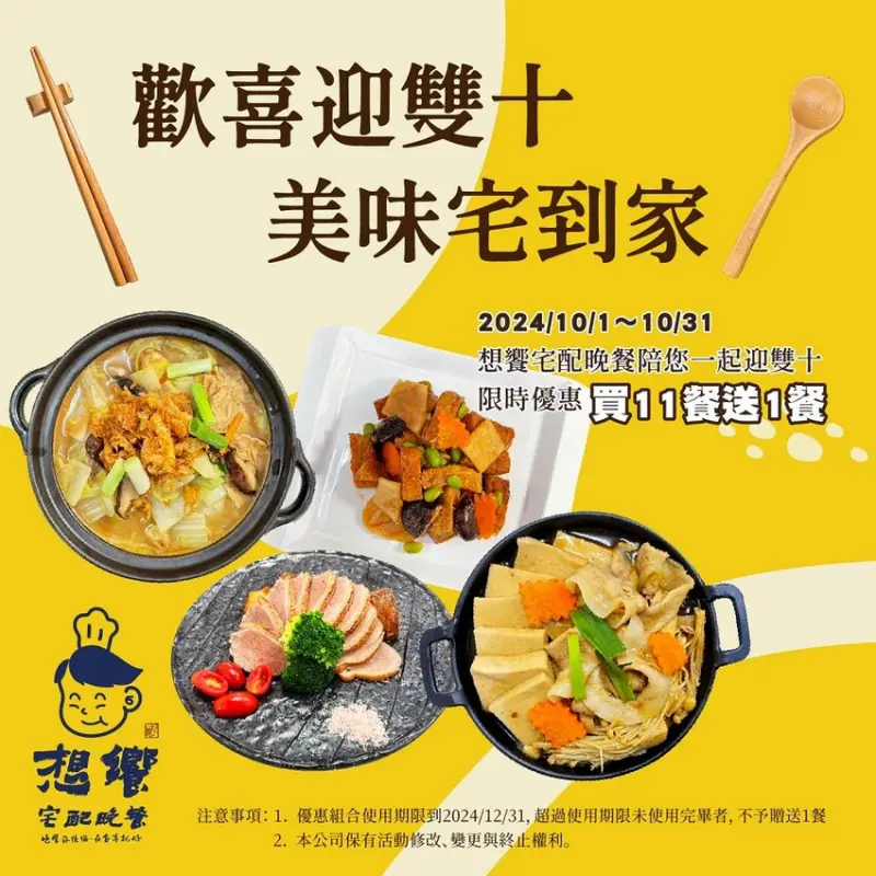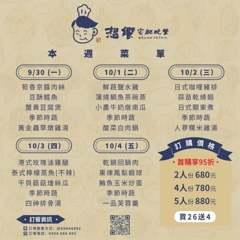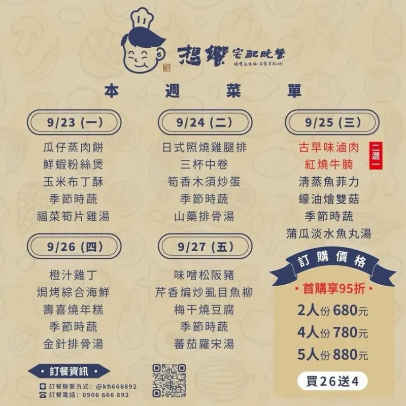 最後,好康報報來了!現在訂購想饗宅配晚餐,第一次訂餐有九五折的優惠。而且還有買二十六送四喔!