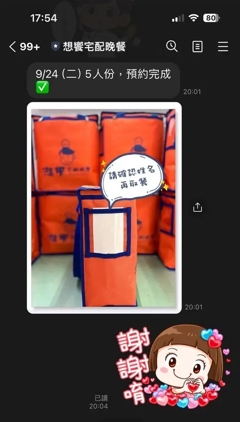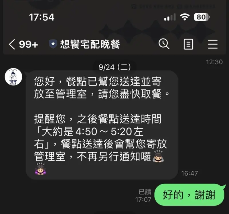 送餐的時間大概會在下午四點半到七點之間送到你指定的地點。送到之後,他們還會用LINE訊息通知你,超方便的啦!而且第一次配送完之後啊,店家也會在LINE上告訴你,之後訂餐大概會在什麼時間送到,是不是超級貼心!