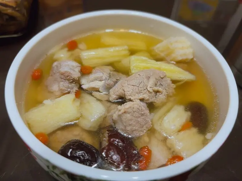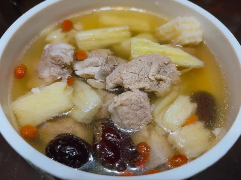 湯品是山藥排骨湯,熬煮過的山藥塊一咬就散開了,排骨的肉也很嫩,不用一直咬。肉汁跟山藥的香氣完全融到湯裡面,再配上枸杞跟紅棗的甜味,讓這個湯喝起來口感層次超豐富,又甘醇美味!