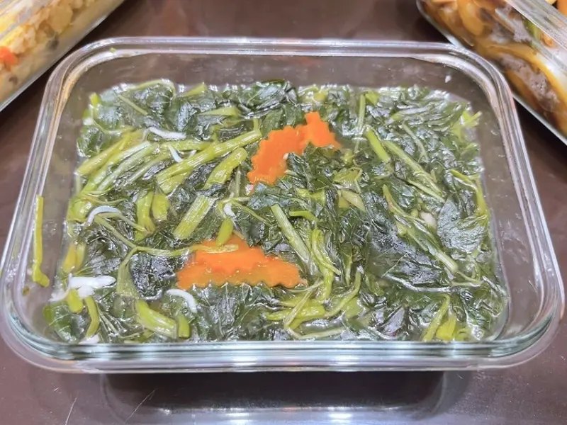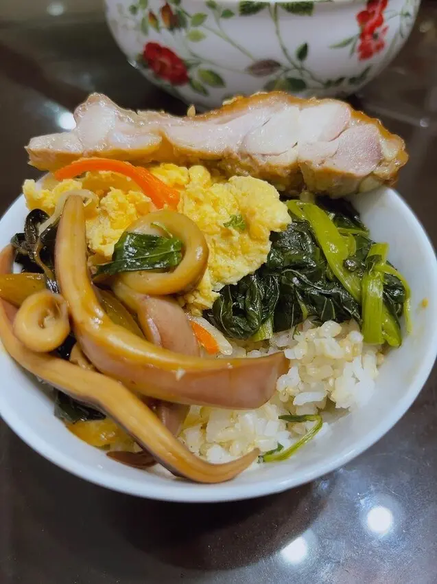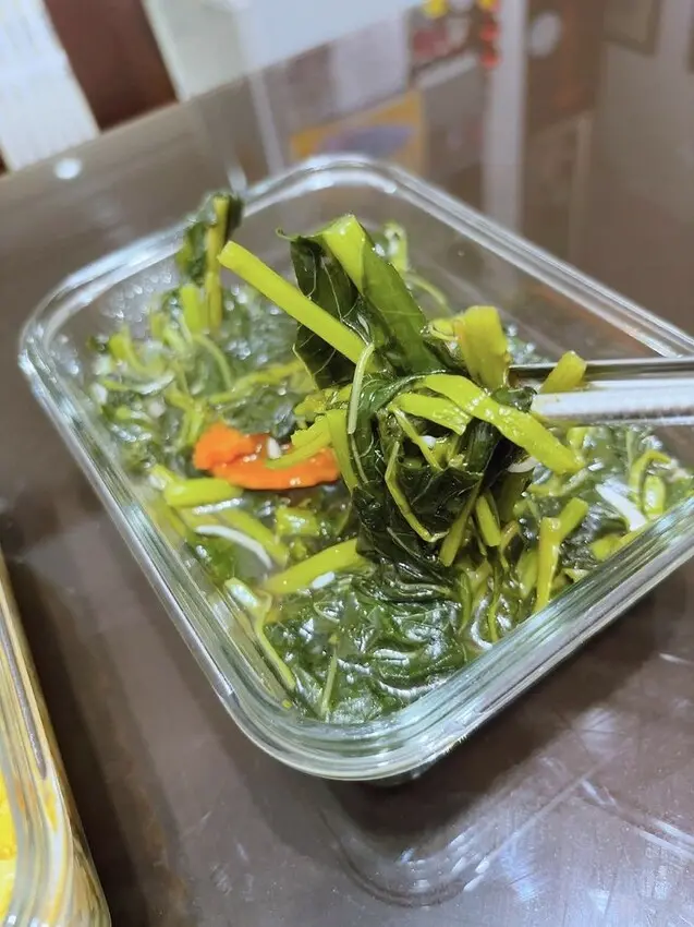 季節時蔬是吻仔魚莧菜,莧菜跟吻仔魚放大蒜快炒,有莧菜跟大蒜的香氣,再加上淡淡的吻仔魚香,鹹淡也是剛剛好。他們是裝在玻璃餐盒裡送到家,雖然開飯時間有點晚,但莧菜竟然沒有悶到變黃捏!