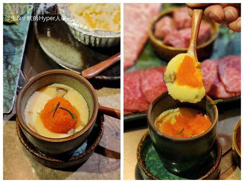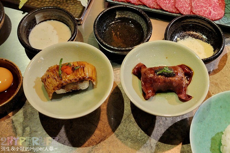 來吃燒肉竟然還有握壽司!左/松葉蟹膏比目魚鰭邊炙壽司、右/義大利黑松露牛肉炙壽司。名字看起來很厲害,吃起來更是耶!到底是來吃燒肉還是日本料理,主廚很有才!兩個之間比較都是軟嫩好吃,雖然強生說他私心更喜歡比目魚的油脂表現,但小吠覺得黑松露牛肉柔軟的口感和香氣也不遑多讓哦😉