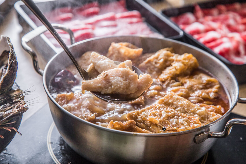 湯底的部分,壽喜燒可以說是鬥牛士二鍋的必點基本款喔。除了壽喜燒,還有北海道昆布鍋、蔬果豚骨鍋可以選。如果你想換換口味,需加價四十九元,可以選擇川味麻辣鍋、韓風部隊鍋、起司牛奶鍋這些。說到壽喜燒湯頭啊,一般的印象都是又鹹又甜對吧,但這裡的壽喜燒湯頭有改良過喔,他們降低了鹹度,甜度也拿捏得很好,煮肉的時候湯頭的味道不會蓋過食材原本的味道,可以讓你吃到食材本身的鮮甜啦,真的超讚的。
