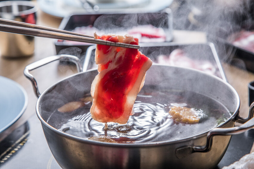 美國牛五花,因為肉切得比較厚,不用擔心煮一煮會散掉,而且熟度也比較好控制。它帶有油花,肉汁感特別濃郁,紅肉部分肉香也很足喔。不得不提這個壽喜燒湯底真的超讚,完全不會過鹹或過甜。