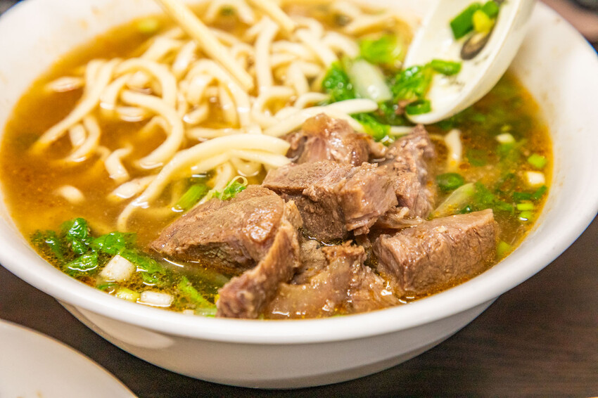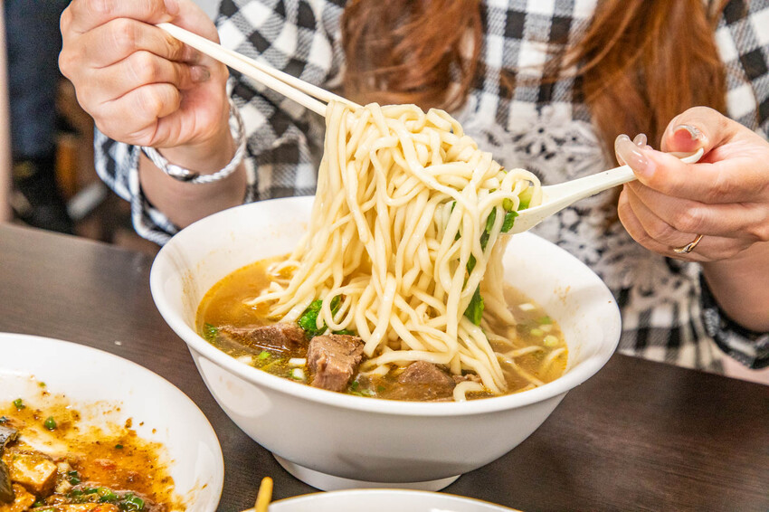 麵條的部分是用中等粗細的拉麵,吃起來是軟中帶Q的口感,我覺得跟這個牛肉湯的味道超級搭。而且麵條的份量也是多到不行,一個大男生吃一碗,絕對飽到天靈蓋去!