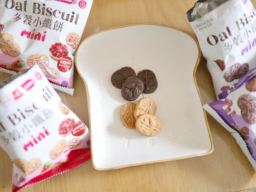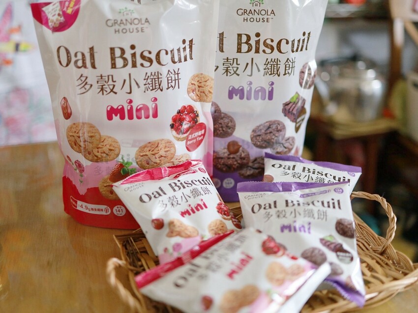 好啦,來講講這次的主角「Mini 多穀小纖餅」囉。它有兩種口味喔,一個是「布朗尼黑巧」,另一個是「法式野莓塔」。它的尺寸就是「宴麥森林」經典的「燕麥纖餅」的MINI縮小版啦。所以大小更剛好,很適合我們大人跟小朋友一起分享這個小纖餅的美味。