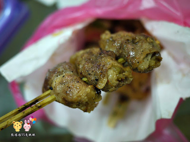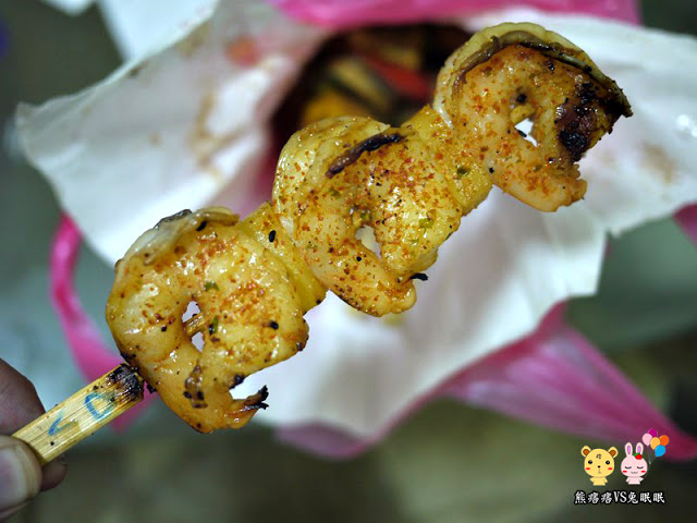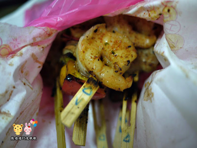 這一串好像是25還是30元?最近已經到了隨便點都不看價格的地步了...只為了嚐試看看不同口味的串燒...冏,這是鳳梨草蝦,蝦子很鮮甜又大隻,吃起來有些脆Q脆Q的,搭配醬料很入口,會讓人想配上一瓶啤酒。
