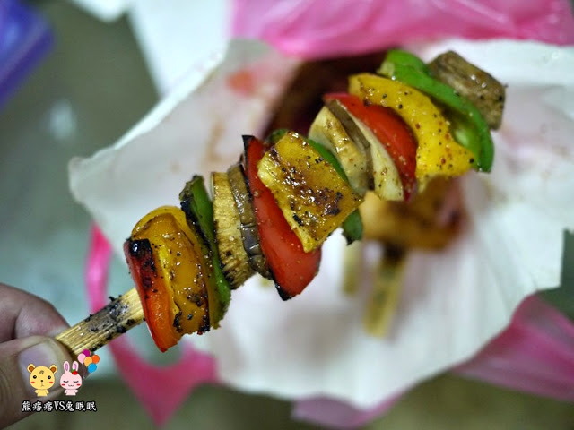這是時蔬,一串20元,裡面的蔬菜種類滿多的,我覺得這串超划算的,色彩搭配的很繽紛,連平常不愛吃蔬菜的我都點了,吃起來很清爽,適合解膩用,另一個牛五花串也很推薦。