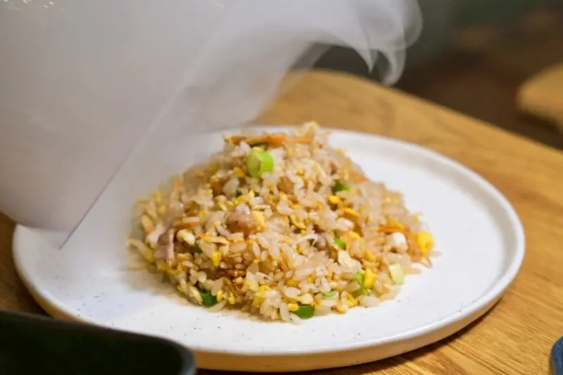 ▼上演精采煙霧秀的雲上索瓦風味飯,炒到粒粒分明香氣十足,裏頭能吃到迷人的櫻花蝦,涮嘴到不知不覺吃光光了!