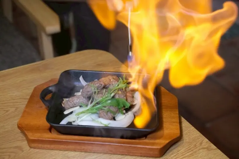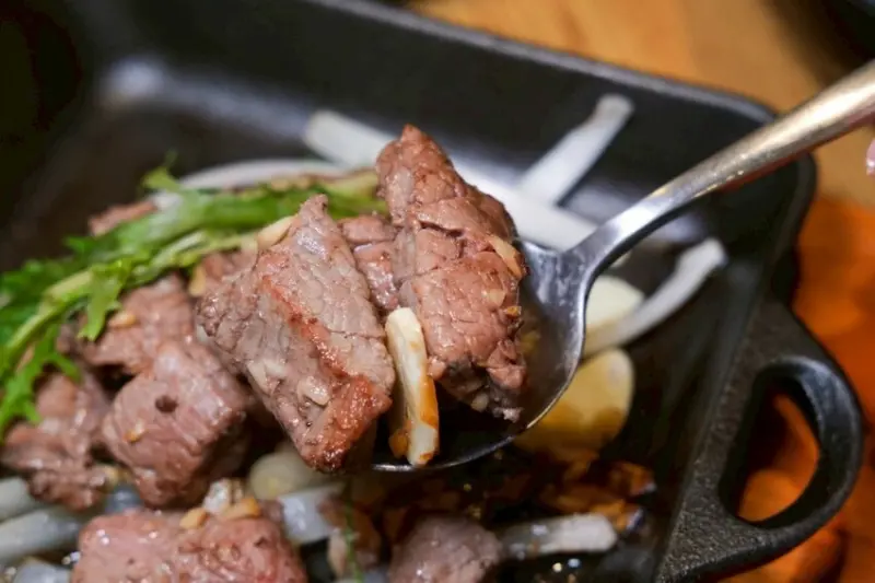▼CP值超高的炙焰肉響套餐,主食有骰子牛、松阪豬、雞腿、鮮魚擇一,上桌還伴隨著浮誇的火焰秀,鎖住滿滿香氣的骰子牛,趁熱咬下還會爆出肉汁,隨著咀嚼散發出肉的甜香!
