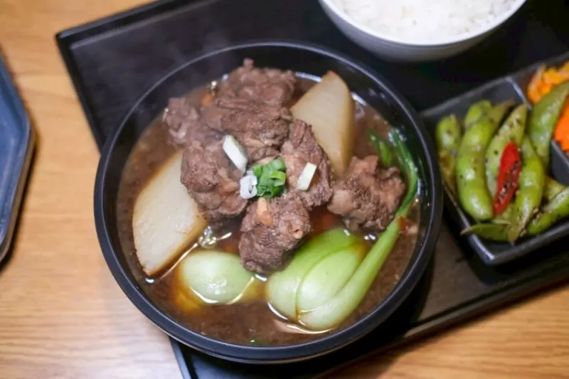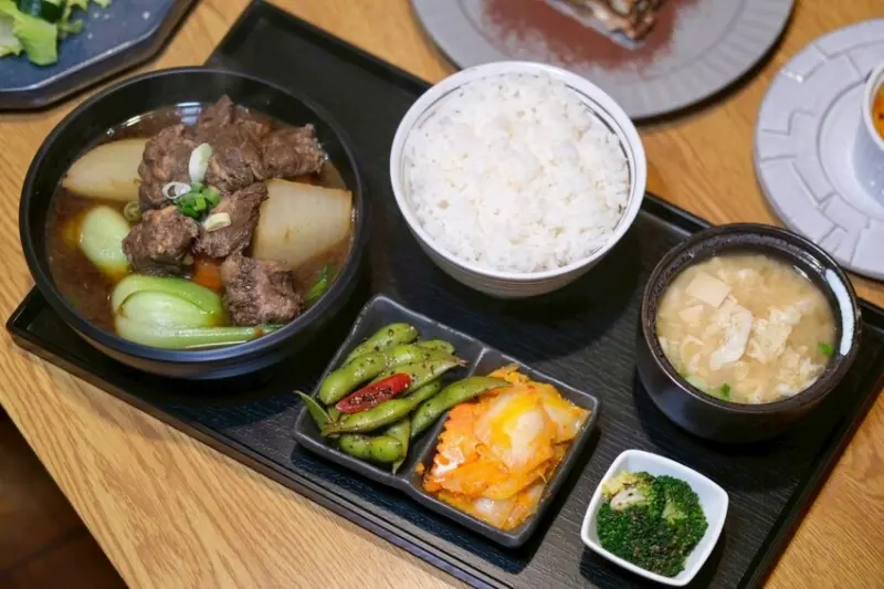 ▼風味定食包含小菜、主食和湯品,喜歡吃牛肉的別錯過這道~ 香噴噴的紅燒牛腩飯,每一塊牛腩都很大塊,燉到軟嫩入味保有口感,還能吃到蔬菜、紅白蘿蔔等,醬汁濃縮了食材精華,甜甜鹹鹹超級下飯!