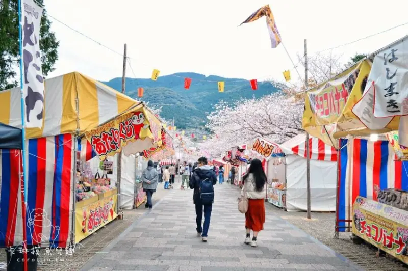 櫻花季時節,神社也會進駐販售各種日式小吃的攤販,充滿了春日限定的熱鬧氛圍。
