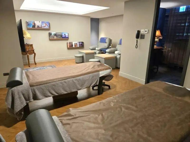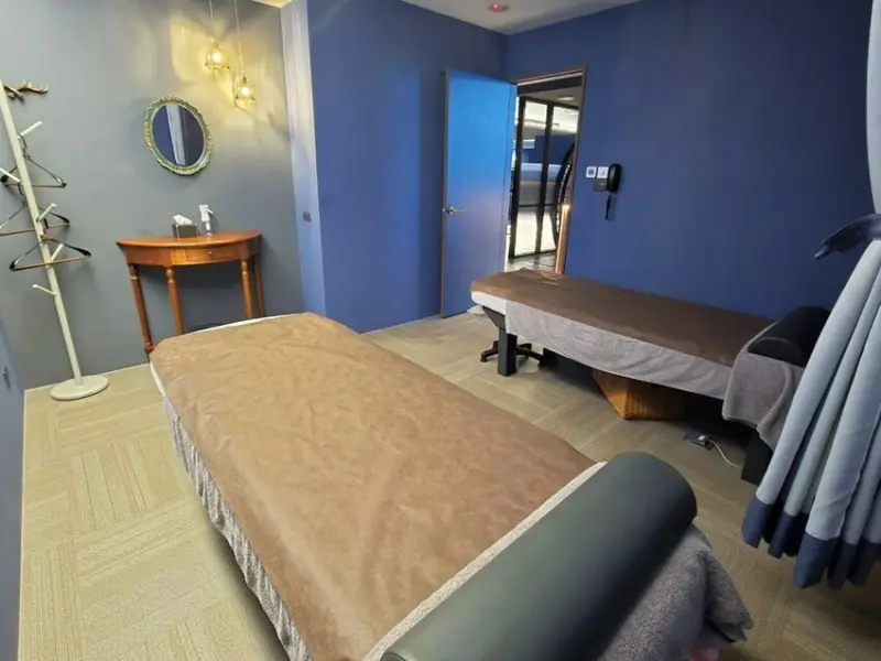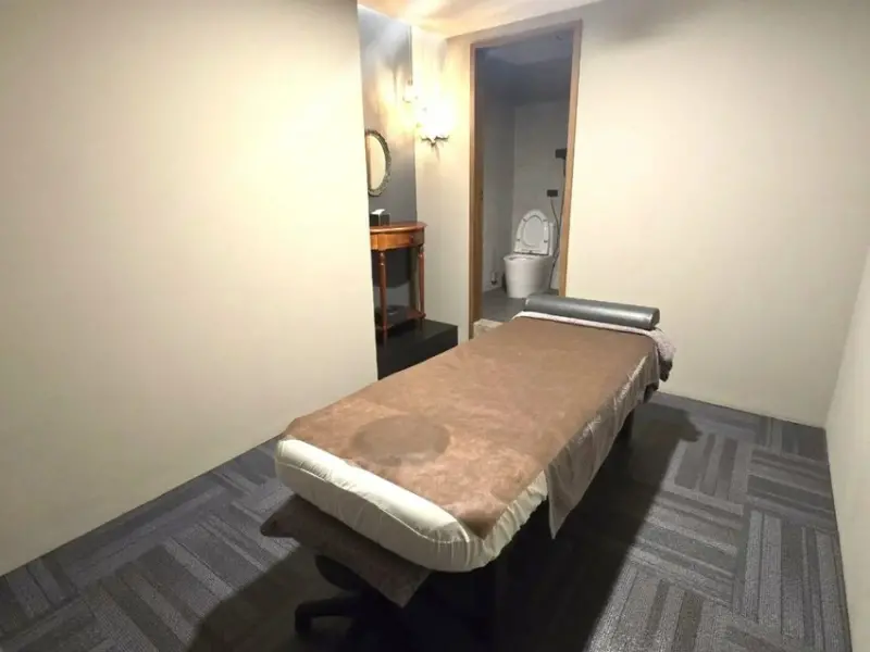 針對按摩房型,個人與雙人房間都有,隔音效果特別優秀,關上門後幾乎聽不到外頭聲音,讓我覺得私密度非常高。這間是雙人房,裡面還有提供小梳妝台和掛勾,即便雙人還是有提供布簾,不論雙人朋友或是情侶都非常合適。