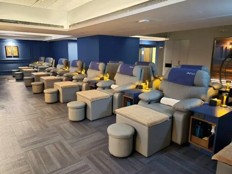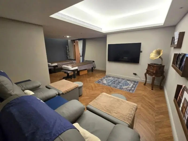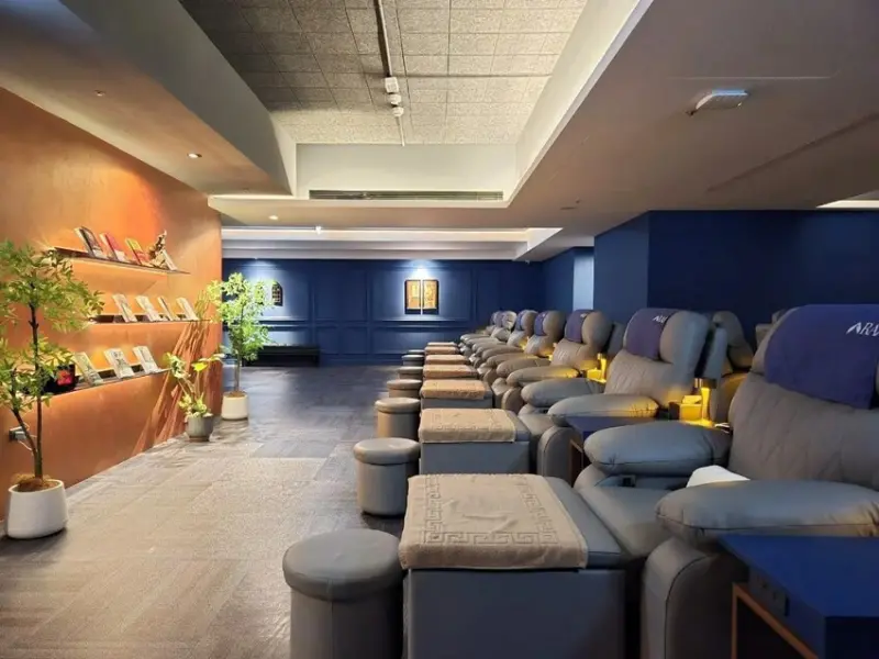 公共空間的腳底按摩區以舒適沙發為主,是我做過的腳底按摩中最舒服的沙發,沙發還能自行調整斜度,不僅如此還有附小桌子與檯燈,每個座位區都貼心設有插座可充電,還能跟櫃台借線.對於充電焦慮者來說真的太友善!